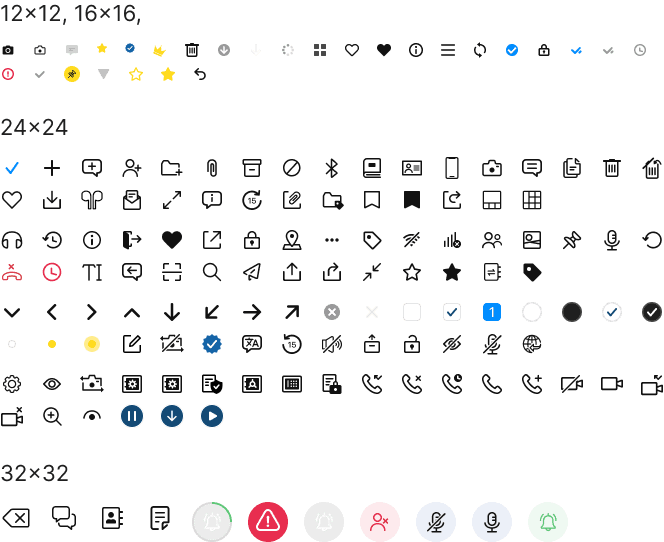 I standardized icons into four sizes: 12, 16, 24, and 32 pixels, applying solid icons in the primary color for visual consistency.