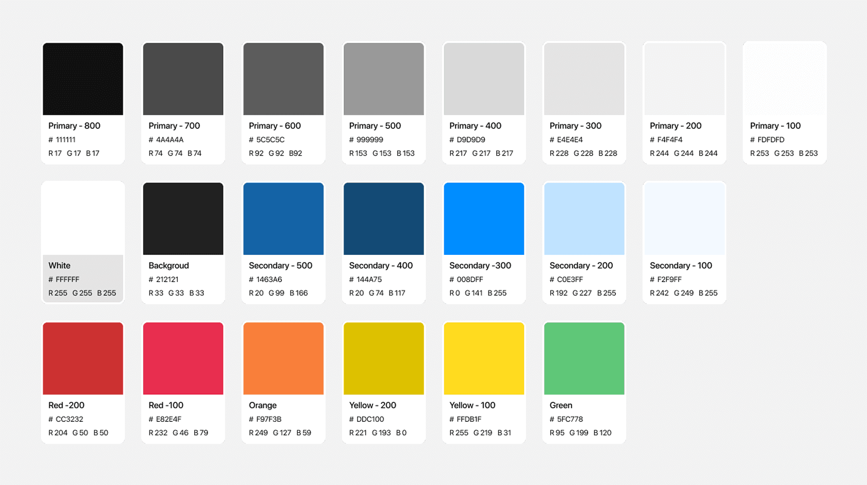 Primary colors are in grayscale, ranging from 800 (darkest) to 100 (lightest).